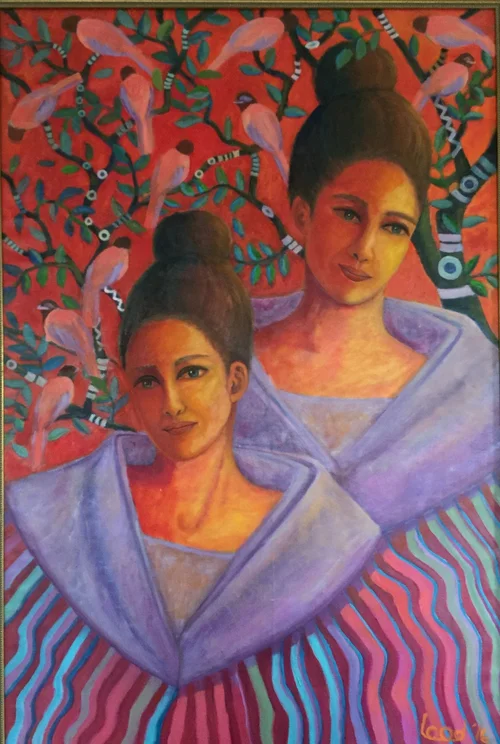 The Filipino family is typically matriarchal, almost always dominated by the female members. In this setting, the spoiled child in the center of the painting looks annoyed, turning away from her doting mother, while the matriarch stands firm, controlling the situation. On the right, two maids wait in attendance. The lovers in the background, represented by “The Kiss”, is a family secret. Here, women wear traditional “baro’t at saya” clothing from the early 1900s, but the skirts are depicted in modern cubic style.